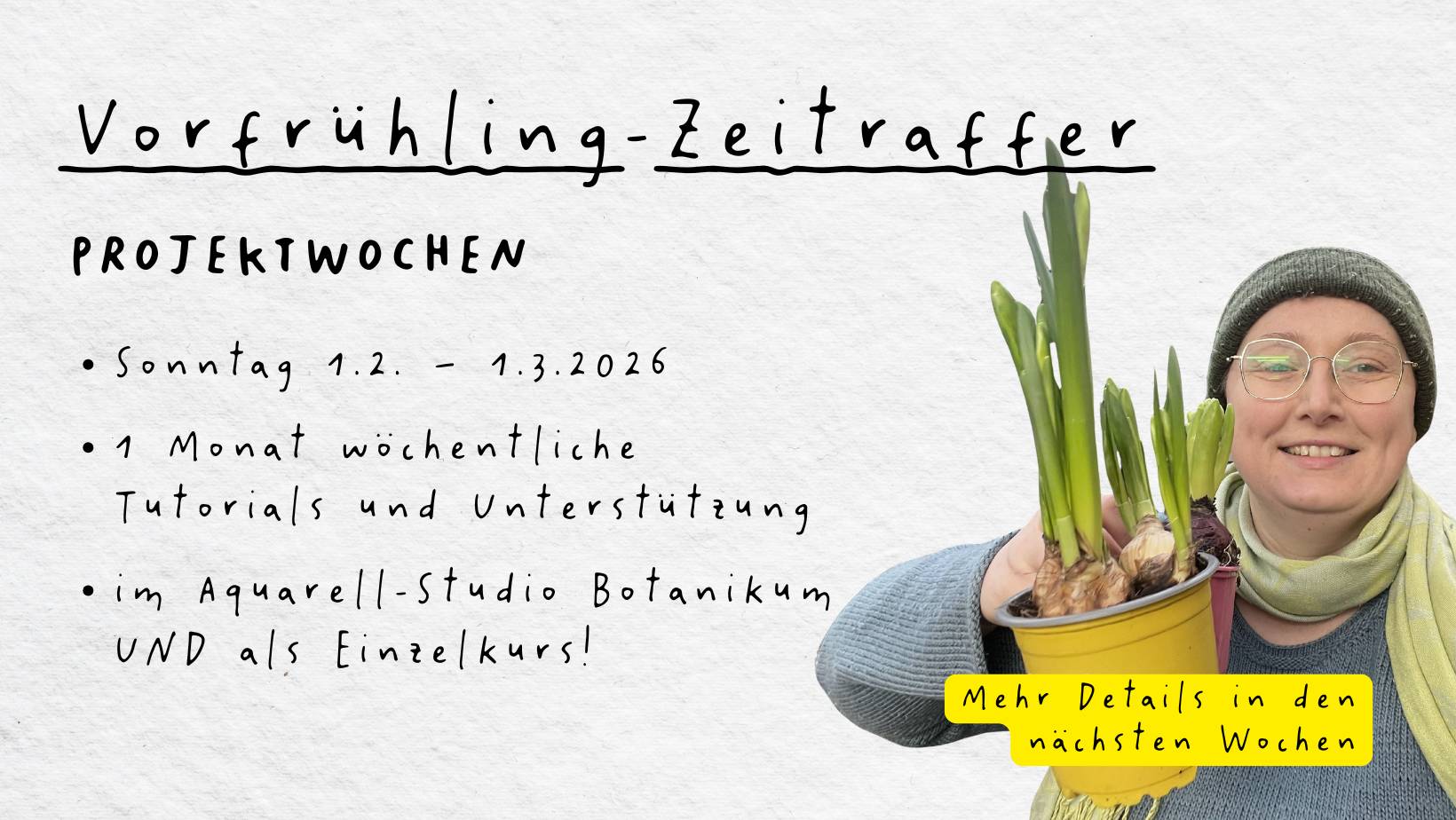 Aber natürlich dürfen wir alle gemeinsam gespannt sein, wie sich das Jahr entwickelt und wie viele Leporellos ich dir zeige. 😜 Und du?Das heißt nicht, dass du dein Skizzenbuch aus dem Fenster werfen solltest. Skizzenbücher haben großartige Vorteile: Transport, Übersicht, dieses wunderbare Gefühl, durch ein gefülltes Buch zu blättern. Aber wenn du auch damit haderst, ein ganzes Skizzenbuch „voll“ zu machen, kann ein Leporello mit 6 Seiten eine richtig gute Alternative sein. Welche Frage würdest du gern ein paar Wochen lang verfolgen? Nur Frühblüher? Ein bestimmter Wegrand? Eine Pflanzenfamilie? Ein Quadratmeter? Und noch ein kleiner Trost zum Januar: Vor-Frühling Zeitraffer ProjektwochenJanuar ist ein genauso guter Zeitpunkt wie jeder andere, um wieder anzufangen zu Malen. Und gleichzeitig ist Januar oft der schlechteste Zeitpunkt, um „das botanische Skizzenbuch des Jahres“ starten zu wollen. (Wir sind mitten im Winter. Bei mir ist wortwörtlich gerade Schneesturm. Vielleicht liegt der Zauber gerade darin, keins zu starten.) Um im Februar dann langsam aber stetig dem Frühling entgegen zu fiebern, starten wieder Projektwochen im Aquarell-Studio Botanikum. Im Vorfrühling-Zeitraffer Projekt beobachten wir 4 Wochen lang einen Frühblüher (draußen oder im Topf) und halten seine Entwicklung in Aquarellskizzen fest. Dazu gibt’s ergänzende Inputs (botanische Neugier und Technik-Experimente) um wieder Schwung in dein botanisches Skizzenbuch zu bringen