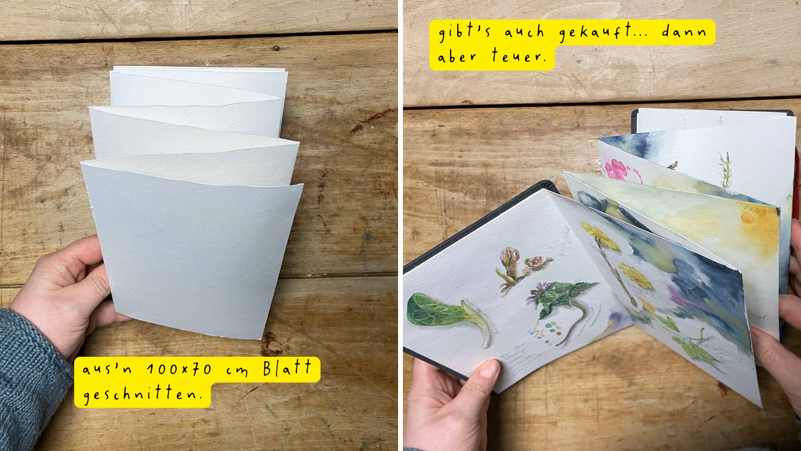 Die Möglichkeiten sind unendlich. Meine Ideenliste leider auch. Mein Experiment 2026: Leporello statt SkizzenbuchAll das ginge natürlich auch in einem gebundenen Skizzenbuch. Aber ich möchte es greifbarer machen. Anschaulicher. Und vor allem: als klar abgegrenzte Mini-Projekte, statt chronologisch aneinander gereiht. Mein Experiment für 2026 sind deshalb selbstgemachte Leporellos (Concertina-“Bücher”), die ich jeweils zu einem Thema fülle. Für den Anfang plane ich: